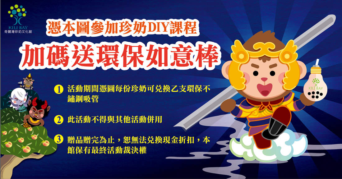 大家不用擔心拉!!!現在就到奇麗灣報名參加手搖珍奶DIY課程,除了教你珍珠奶茶的做法和提供好喝的獨家配方以外,憑圖再送你環保禁塑如意棒(不鏽鋼珍珠奶茶吸管)乙支!!喝完珍奶再用滿​滿的活力一起去參觀災防大聖西遊記科技互動展當個小小孫悟空一同前往"吸"域取經~